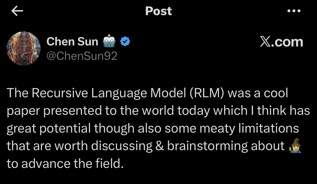 Qué es RLM-Qwen3-8B: - Es un Qwen3-8B (modelo pequeño de 8B parámetros) que ha sido fine-tuned para operar NATIVAMENTE como un RLM. - Se entrena con ~1.000 trayectorias RLM generadas por Qwen3-Coder-480B-A35B (60× más grande) actuando como RLM. Por qué importa: - Demuestra que el comportamiento RLM se puede DESTILIAR de un modelo grande a uno pequeño. - El modelo aprende cuándo hacer subcalls, cómo chunkear, y qué inspeccionar — estrategias que un modelo vanilla ignora. - Resultado: +28.3% de media respecto a Qwen3-8B base como RLM, con menor coste de inferencia. Insight clave para el público: no es solo un scaffold alrededor del modelo. El modelo ha APRENDIDO a ser un RLM. El runtime le da la infraestructura, el fine-tuning le da la inteligencia.