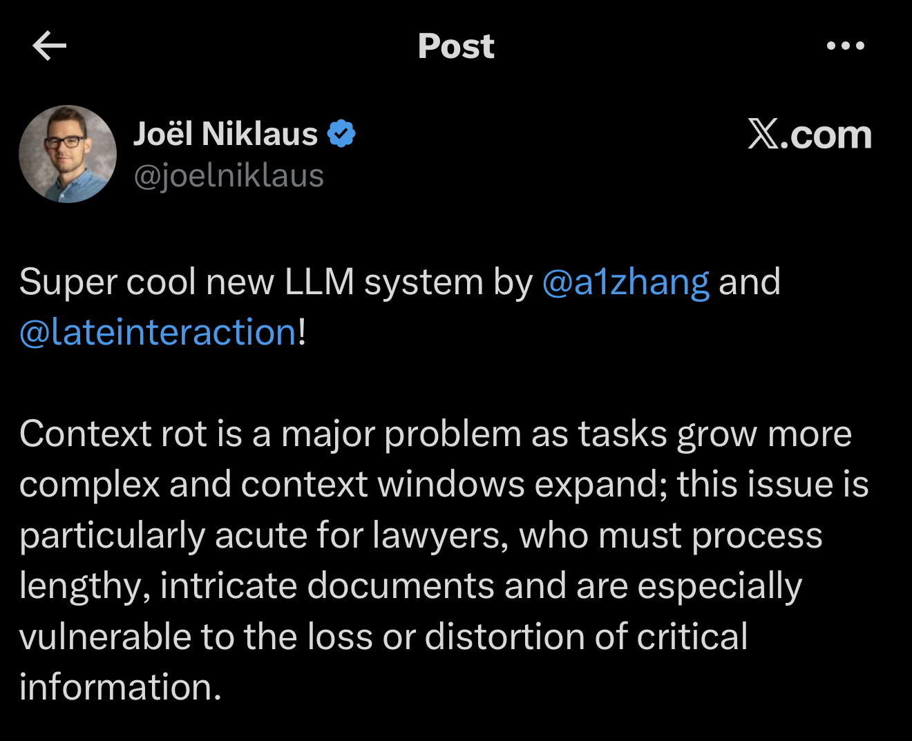 Tres ideas sencillas. Juntas eliminan el context rot: el modelo siempre trabaja sobre trozos pequeños, sin importar el tamaño total.
